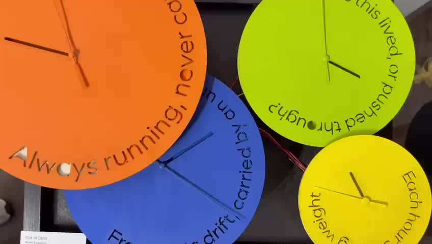Out of Orbit is an experimental typographic work that treats time as structure and stress as form. Four rotating circles, work, family & friends, hobbies, and body & wellness, orbit a restrained clock. At first glance, the typography appears orderly, but closer inspection reveals tension: